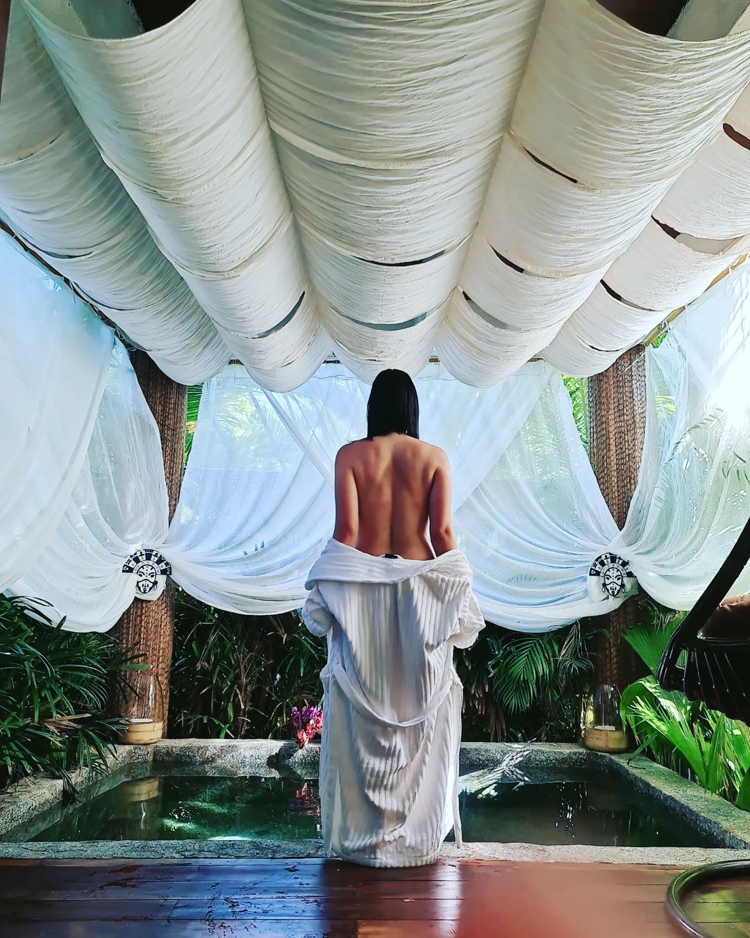 Disfruta de la privacidad de un ojo de agua inmerso en la naturaleza y toma un baño de energía en nuestra alberca con jacuzzi, construida con una mezcla de resina de árbol y piedra caliza “Chukúm” utilizada por los mayas para igualar el turquesa de un cenote.